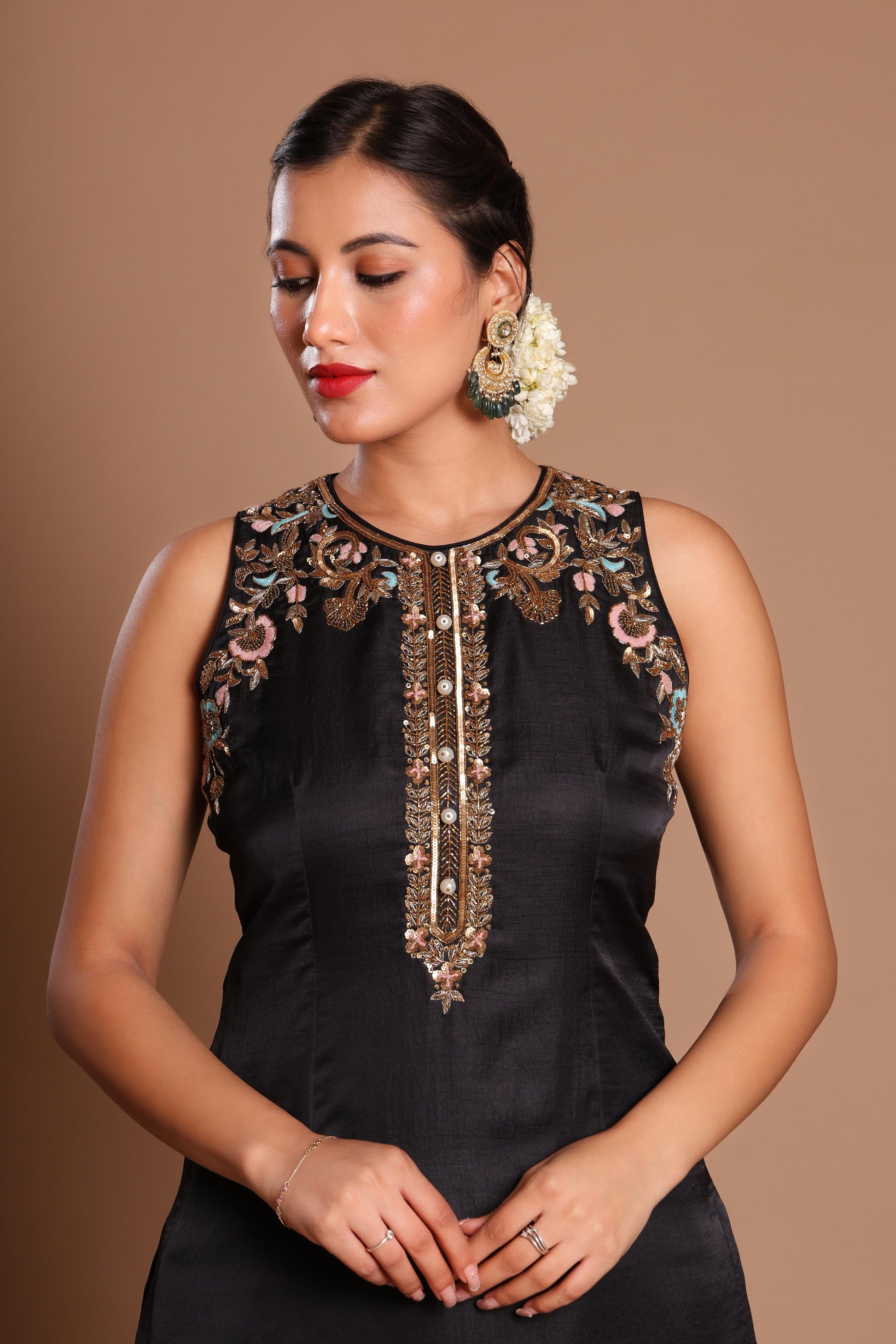 Elevate your style with our BLACK MUGHAL MAJESTY KURTA SET. This ensemble features a black sleeveless kurta adorned with stunning gold embroidery and farshi-style pants in a sophisticated gold and black pattern. Complete your look with white earrings and nude heels. The perfect blend of elegance and tradition.