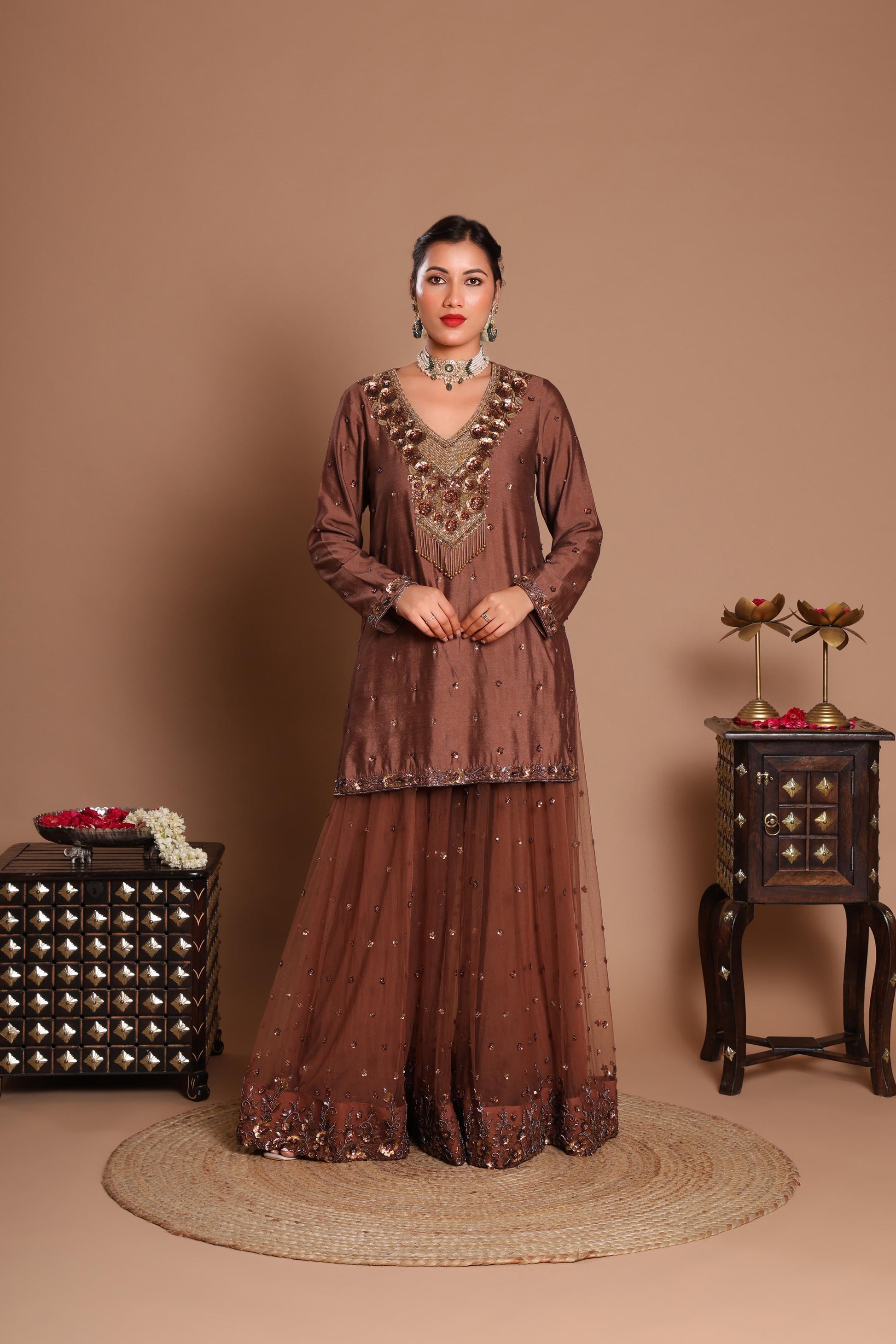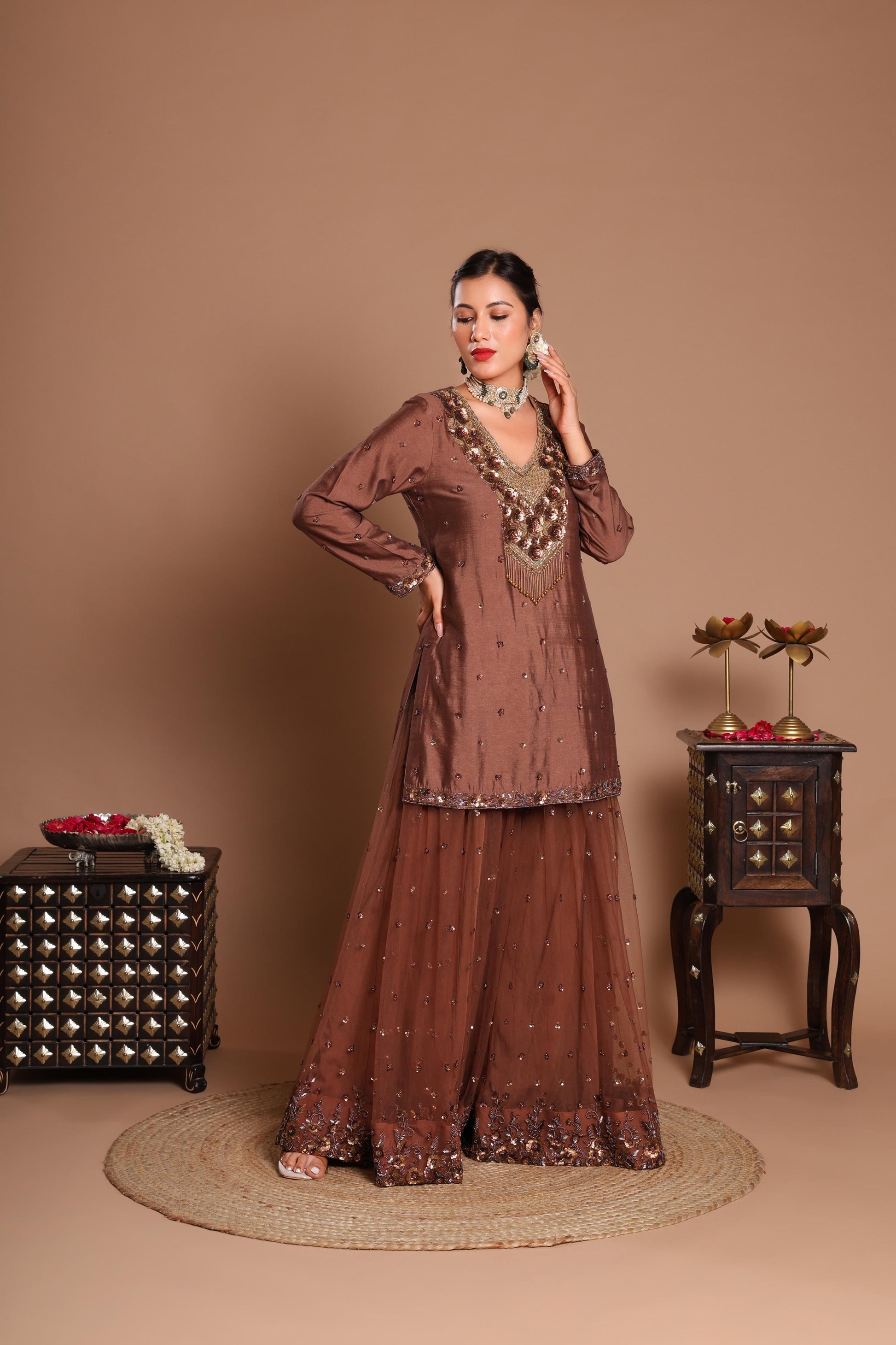 This is an elegant and festive sharara set in a rich, warm brown tone. The short kurti is made from luxurious chanderi silk, which has a subtle sheen. The V-neckline is a focal point, adorned with heavy and intricate hand embroidery using beads and sequins in gold, brown, and dark shades, creating a detailed and ornamental design.