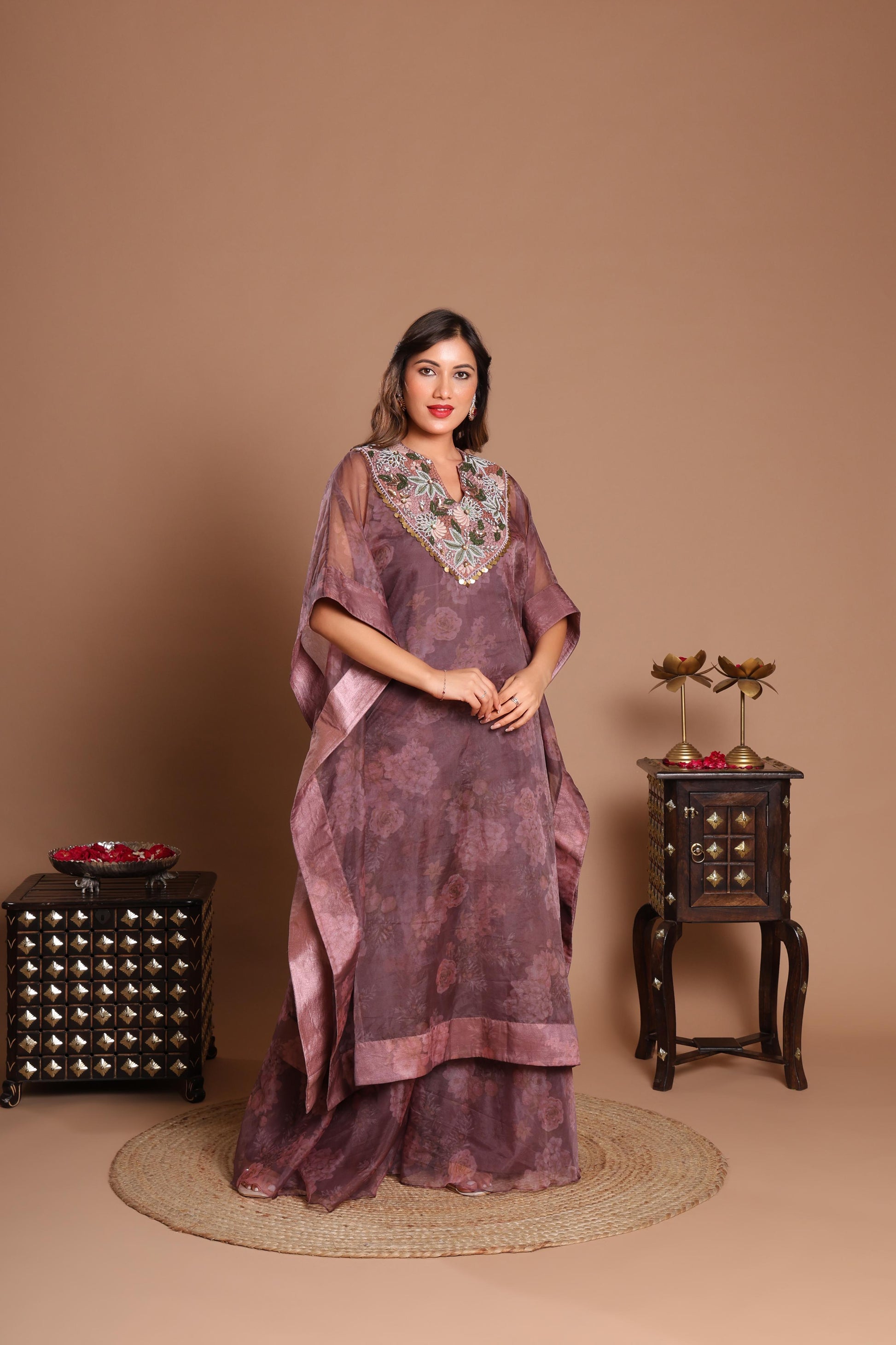 Below the kaftan, a matching organza sharara provides a traditional and flowy bottom. The entire ensemble is cohesive, with the floral print continuing from the top to the bottom. This outfit is a beautiful blend of traditional design and modern comfort, perfect for special occasions.